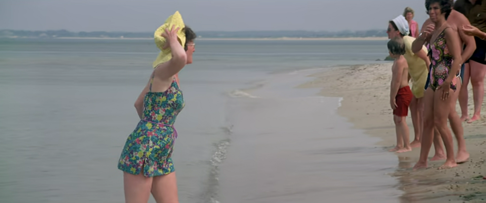 Sådan starter Jaws, kort før den rigtige svømmer, Chrissie, bliver flået i stykker af hvidhajen der danner ramme for fortællingen om det arkeamerikanske og homogene lokalsamfund, Amity Island.