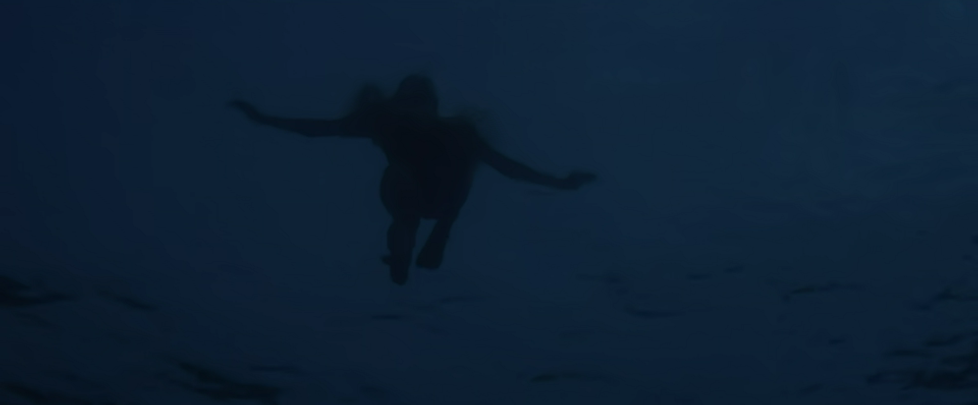 Vi svømmer gennem tang og ålegræs, en ukendt, men allerede foruroligende skikkelse på havets bund. Kameraet er vores øjne—hajen er vores krop. Plakaten kropsliggøres fra start af: Ikke med publikum som den uskyldige svømmer på overfladen, men som monsteret fra dybet.
